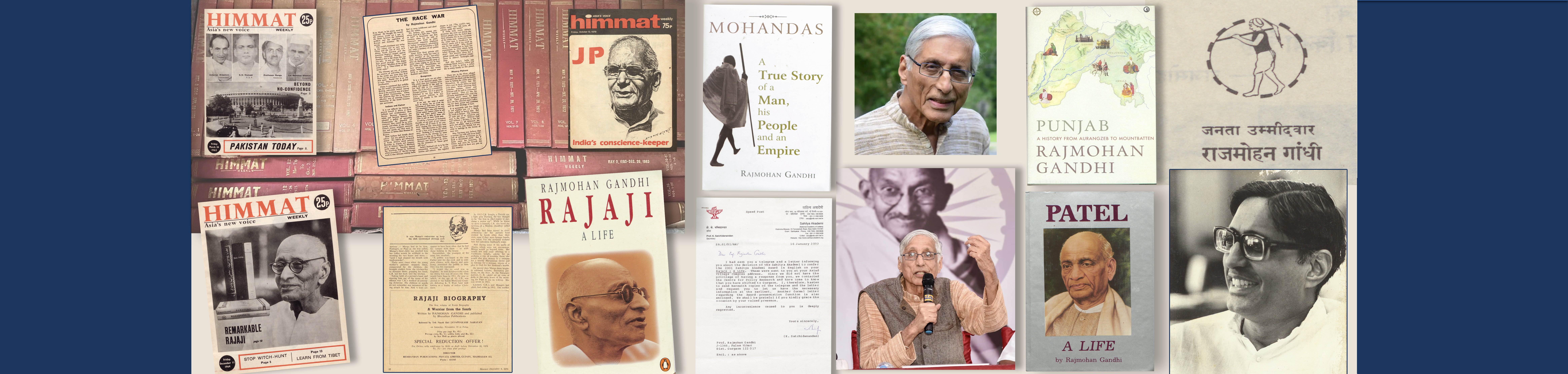 A prolific writer and historian, Rajmohan Gandhi’s writings cover the Indian independence movement, its leaders, Indo-Pakistan relations, human rights, and conflict resolution. His body of work includes landmark biographies of Sardar Vallabhbhai Patel, Mahatma Gandhi, C. Rajagopalachari, Khan Abdul Ghaffar Khan and Maulana Abul Kalam Azad. Notable publications include The Rajaji Story: A Warrior from the South (two vols. 1978 & 1984). Eight Lives: A Study of the Hindu-Muslim Encounter (1986), Understanding the Muslim Mind (1987), Patel: A Life (1991), Rajaji: A Life (1997), Ghaffar Khan: Nonviolent Badshah of the Pakhtuns (2004), Mohandas: A True Story of a Man, His People and an Empire (2006), A Tale of Two Revolts (2009), Punjab: A History from Aurangzeb to Mountbatten (2013), and Modern South India: A History from the 17th Century to Our Times (2018), among many others. Rajaji: A Life received the Sahitya Akademi Award in 2002, and Mohandas was awarded the Indian History Congress Biennial Award in 2007.