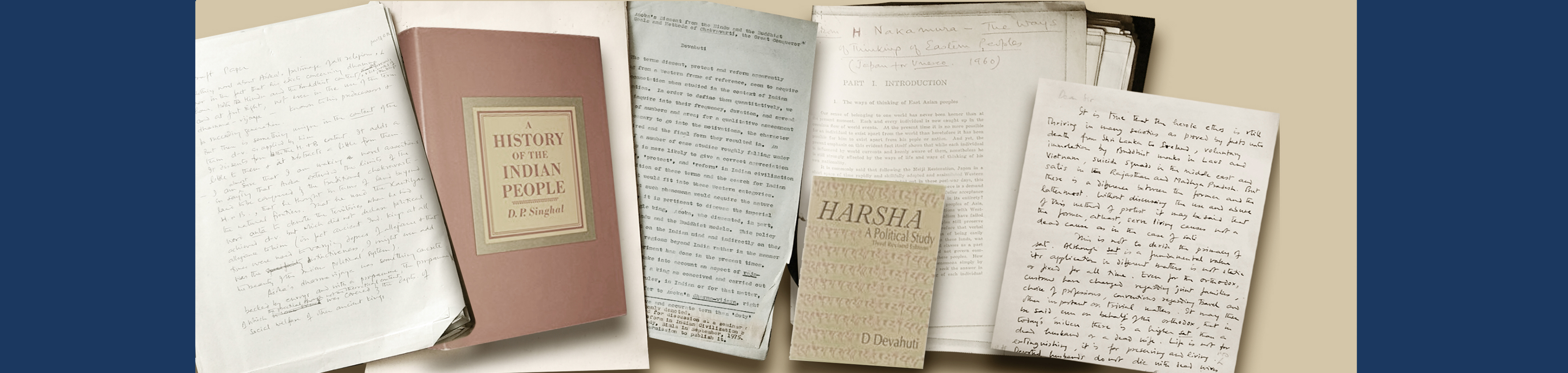 About the Collection: The collection of the papers of Profs. Devahuti and Damodar Prasad Singhal consists of research material on Southeast Asia and ancient Indian history, religion, art, culture and civilization. There are handwritten notes and drafts/chapters of some of the books, partly finished manuscripts on historiography, religion, gypsies, world civilization, nationalism, India’s neighbours and its diplomatic relations. The collection also contains numerous articles on the status of women in later Vedic age, the practice of sati and folk woman as depicted in ancient Indian art. Several pamphlets on history and society, and issues of some rare journals also form a part of the collection. (Catalogue available)