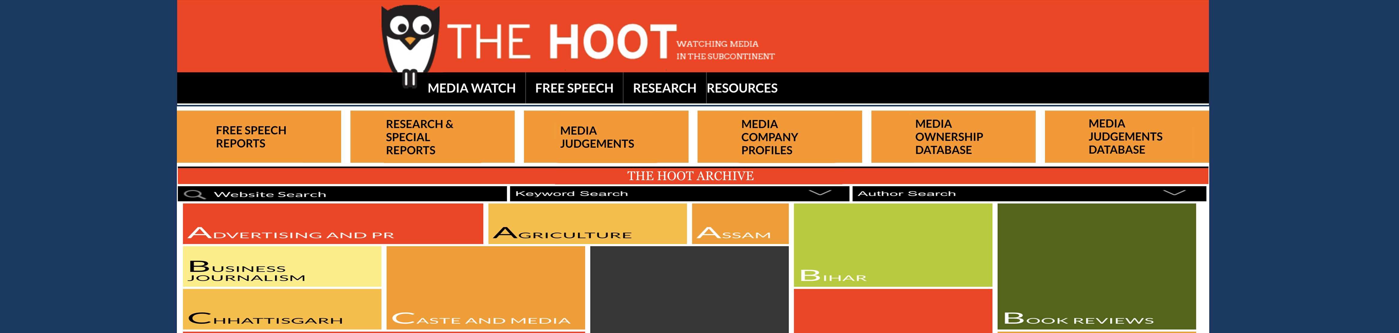 The Hoot Archive has been created under the auspices of the Media Foundation based in New Delhi. The Foundation is a society of like-minded individuals founded in 1979 to promote, support, encourage and undertake social science, statistical and scientific research pertaining to the print, electronic, film and other media. To achieve these objectives they sponsor research projects, studies, publications, lectures, seminars and discussions. They also promote and support research and development in appropriate, adaptive and advanced technology with a view to making the media accessible to the masses at low cost, especially in rural areas. Besides, they offer grants, stipends and many other facilities for encouraging the growth of skills, opportunities, experience that enhance creativity, professionalism, and excellence among practitioners.